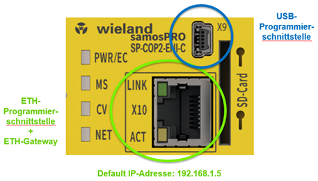 Oltre all' interfaccia Ethernet, samos®PRO COMPACT dispone di porte mini-USB e per schede SD. La macchina può quindi essere programmata in modo flessibile. Allo stesso tempo, i programmi possono essere rapidamente duplicati o scambiati. Questo accelera la messa in servizio e riduce enormemente i tempi di fermo macchina.